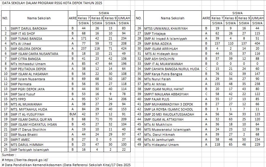 Program RSSG 2025 dirancang untuk memberikan pendidikan gratis di puluhan SMP/MTs swasta, dengan total 49 sekolah mitra dari akreditasi A, B, hingga C yang telah memenuhi syarat sebagai penerima pembiayaan pemerintah. Sekolah mitra RSSG memiliki kapasitas besar untuk menampung siswa kelas 7, sesuai tabel resmi yang dirilis pemkot Depok.