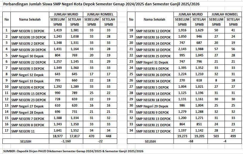 Swara Pendidikan (Depok) — Penerapan Sistem Penerimaan Murid Baru (SPMB) SMP Negeri Kota Depok Tahun 2025 menunjukkan dampak signifikan terhadap jumlah siswa di 34 SMP Negeri. Berdasarkan data Dapodik Dirjen PAUD Dikdasmen Semester Genap 2024/2025 dan Semester Ganjil 2025/2026, Tim Litbang Swara Pendidikan menghimpun dan menganalisis perubahan mencolok antara kondisi sebelum dan sesudah pelaksanaan SPMB, dengan fokus pada siswa aktif yang tercatat di sekolah induk.