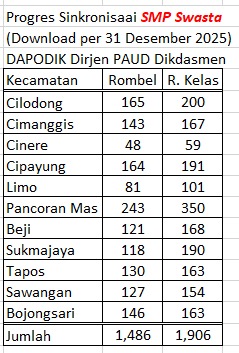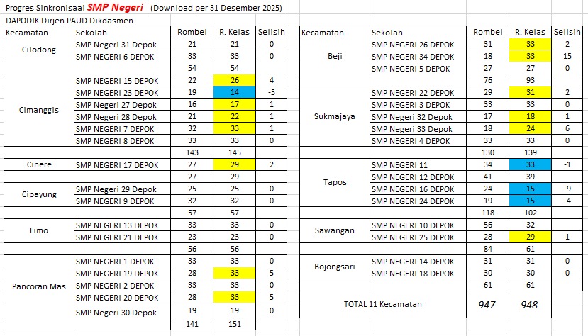 Ketimpangan rombel ruang kelas SMP Depok juga memunculkan pertanyaan mendasar: apakah sekolah-sekolah tingkat SMP di Kota Depok telah memiliki ruang kelas yang seimbang dengan jumlah rombel? Ataukah justru terdapat banyak ruang kelas kosong dan sejumlah rombel yang belum memiliki ruang kelas tetap? Pertanyaan ini terjawab melalui Data Dapodik Paud Dikdasmen per 31 Desember 2025, yang tercatat tersinkronisasi sebesar 98,90% dan menampilkan gambaran lengkap tentang kapasitas ruang kelas dan jumlah rombel SMP Negeri maupun Swasta di Depok.