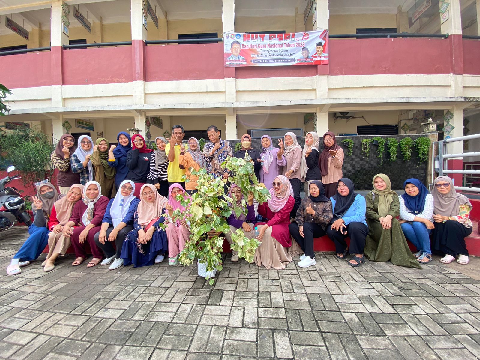 Pemberian kenang-kenagan berupa pohon waru varigata  tersebut dihadiri semua guru SDN Bojongsari 01.